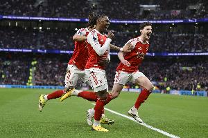 体育资讯4月26日讯 英超第34轮,阿森纳迎战纽卡斯尔,第9分钟,阿森纳通过右侧角球制造机会,埃泽破门。