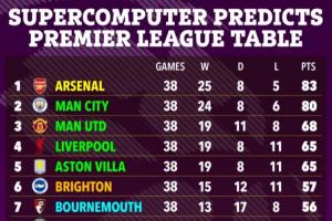 体育资讯04月27日讯 英超争冠和保级都进入关键阶段,据太阳报报道,超级计算机预测了本赛季的英超大结局,阿森纳将以3分优势夺冠,而热刺将降级。