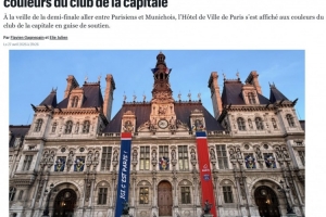 在明天凌晨进行的欧冠半决赛首回合,巴黎圣日耳曼将在主场迎战拜仁。当地时间本周一晚,巴黎市政厅外装饰为巴黎圣日耳曼俱乐部的颜色,并悬挂了巴黎圣日耳曼俱乐部的传统加油口号“这里是巴黎”的标语。以此表示对俱乐部的支持。