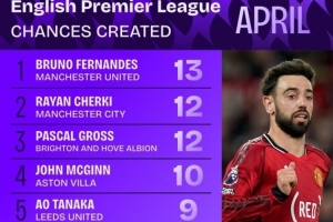 体育资讯4月30日讯 数据机构squawka统计了英超4月创造机会情况,B费力压谢尔基居首。