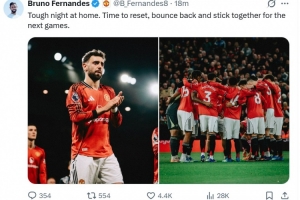 本场比赛B费送出精彩助攻帮助卡塞米罗破门,他也在个人社媒晒出本场照片鼓励球队,写道:“主场经历一场艰难的失利,现在是时候进行休整,我们会在下一场比赛团结一致重振旗鼓。”