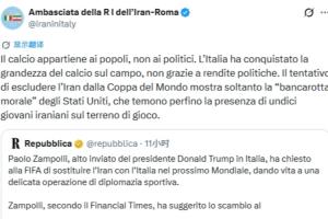 伊朗驻意大利罗马大使馆随即在社交媒体发文回应:“足球属于人民,而非政客。意大利的足球辉煌是在赛场上拼来的,绝非仰仗政治红利。企图剥夺伊朗的世界杯参赛资格,恰恰暴露了美国的‘道德破产’——他们甚至连十一名伊朗年轻球员现身赛场都心怀忌惮。”