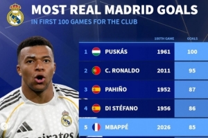 德转列皇马百场进球榜:普斯卡什100球、C罗95球 姆巴佩85球列第5